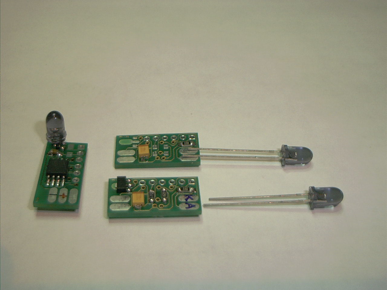 IR diodo pa prispajkaš kratko nožico 'K' (katodo) na mesto bližje uporu (črni 330), daljšo nožico 'A' (anodo) pa na mesto proti spodnjemu robu ploščice.