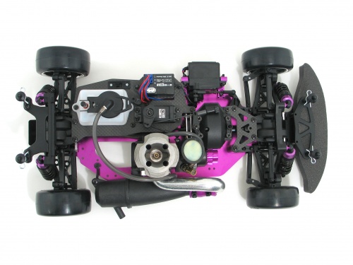 Included in the Stage-D conversion is a mid-engine chassis that relocates the engine to the middle of the car to optimize the balance of the car for drift driving, tested and designed by the HPI Japan drift crew. The new chassis is precision machined from 3mm aluminium for durability and track-tuned stiffness. Strategic lightening holes shift the balance of the car to the front, making the car pivot and drift easily in the corners. Fully countersunk chassis holes allow for extremely low ride height. For custom looks, the alloy chassis is anodized in brilliant purple. And, all of the necessary chassis conversion hardware is included... front and rear drive shafts, exhaust header, billet alloy servo mounts, alloy upper deck stand-offs, zero degree rear uprights, screws, fuel tubing and an instruction manual to make the conversion easy.