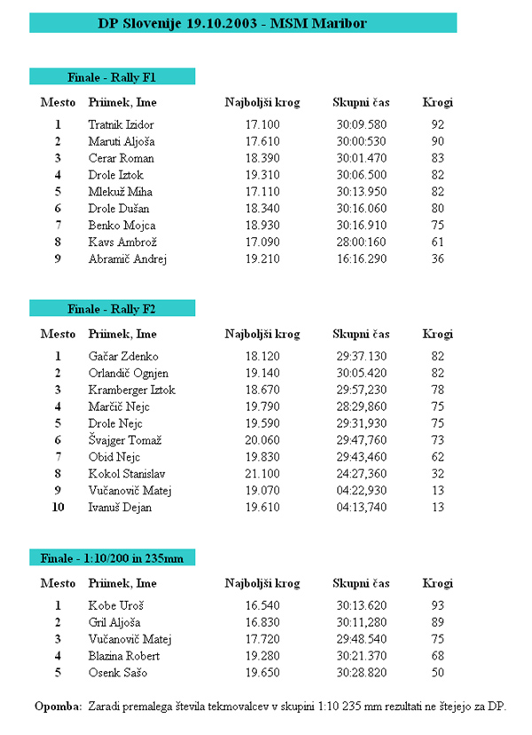 Tako, pa je zaključena še zadnja tekma za DP Slovenije. Upam da ste z našo organizacijo in pripravo proge bili zadovoljni glede na to, da smo tekmo organizirali prvič. Največja zahvala za izvedbo prireditve gre našemu vestnemu članu Tomažu (Fuelboy) in seveda vsem ki so mu pomagali. Zahvalil bi se tudi vsem ostalim ki so na kakršenkoli način pripomogli k izvedbi prireditve.